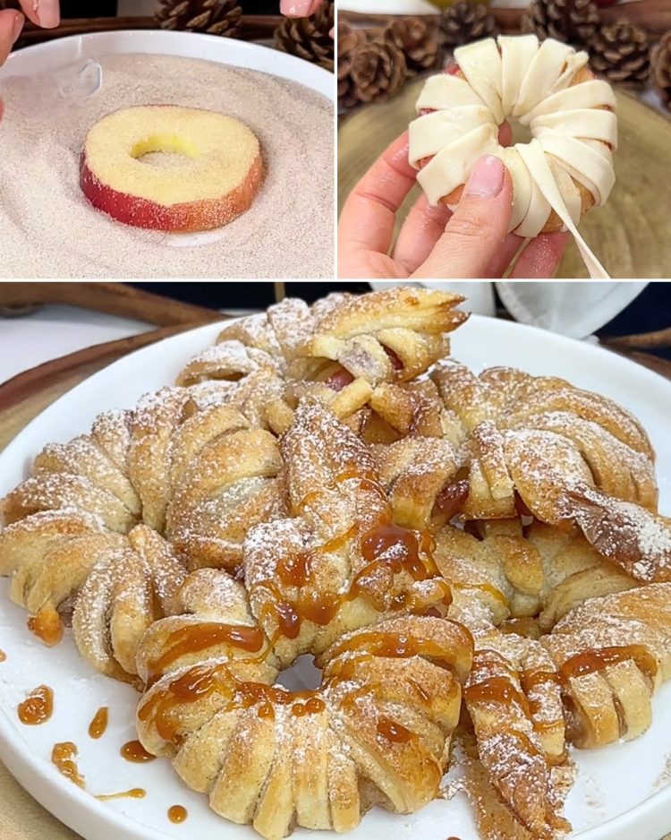 Think of these as apple rings that are part donut and part pie. They’re made by wrapping apple slices in strips of puff pastry and dusting them with a cinnamon-sugar mix.