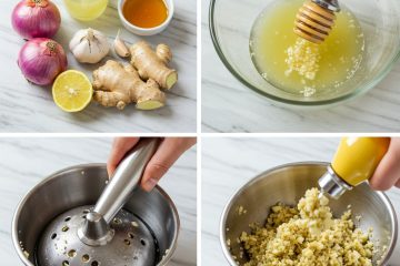 Mix together the grated ginger, onion, garlic, lemon juice and honey. Here’s how to make it