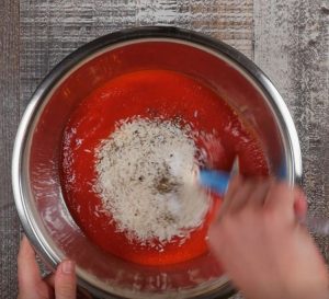 3. In a large mixing bowl, combine the tomato sauce, rice, salt and half of the coarse ground pepper. Mix well to combine; this is your casserole mixture.