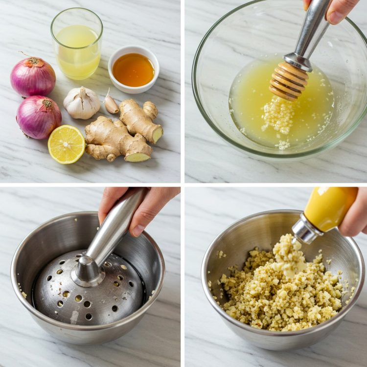 Mix together the grated ginger, onion, garlic, lemon juice and honey. Here’s how to make it