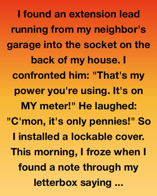 I went straight over and confronted him. “That’s my power you’re taking,” I said firmly. “It’s running on MY meter!” He simply laughed it off, trying to make it seem like a small thing. “C’mon, it’s only pennies!” he chuckled. Despite his casual attitude, I was upset. It felt like stealing, no matter how little electricity it was. So, to stop it from happening again, I went out and installed a lockable cover over the outdoor socket.