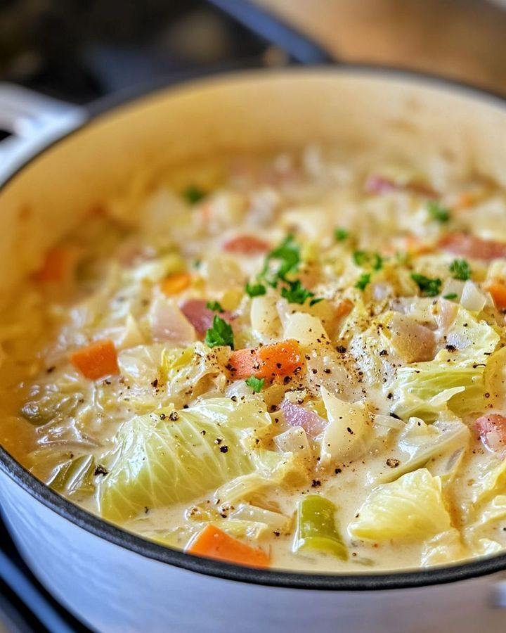This creamy Southern cabbage soup is a comforting and surprisingly rich dish. The simple flavors of tender cabbage, onion, and garlic are simmered in a savory broth, then enhanced with heavy cream and a hint of smoked paprika for a wonderfully smooth, warm, and satisfying meal.