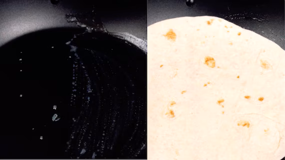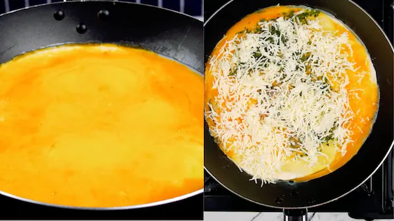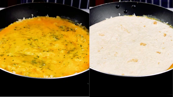 Mix everything with a fork and place the second flatbread carefully over the eggs and cheese. Cover with a lid and cook for 2–3 minutes on medium-low heat.
